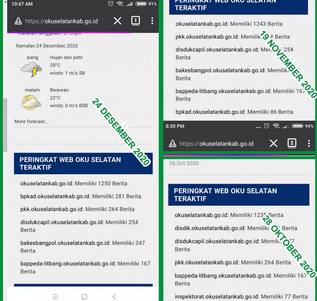 Pada tanggal 18 November 2020 website Pemerintah okuselatankab.go.id tetap menjadi rangking pertama, dilanjutkan pkk.okuselatankab.go.id – disdukcapil.okuselatankab.go.id – bakesbangpol..okuselatankab.go.id – bappeda.litbang.okuselatankab.go.id sebagai urutan peringkat 2 sampai 5 besar. Sedangkan website bpkad.okuselatankab.go.id menempati peringkat 6 besar.