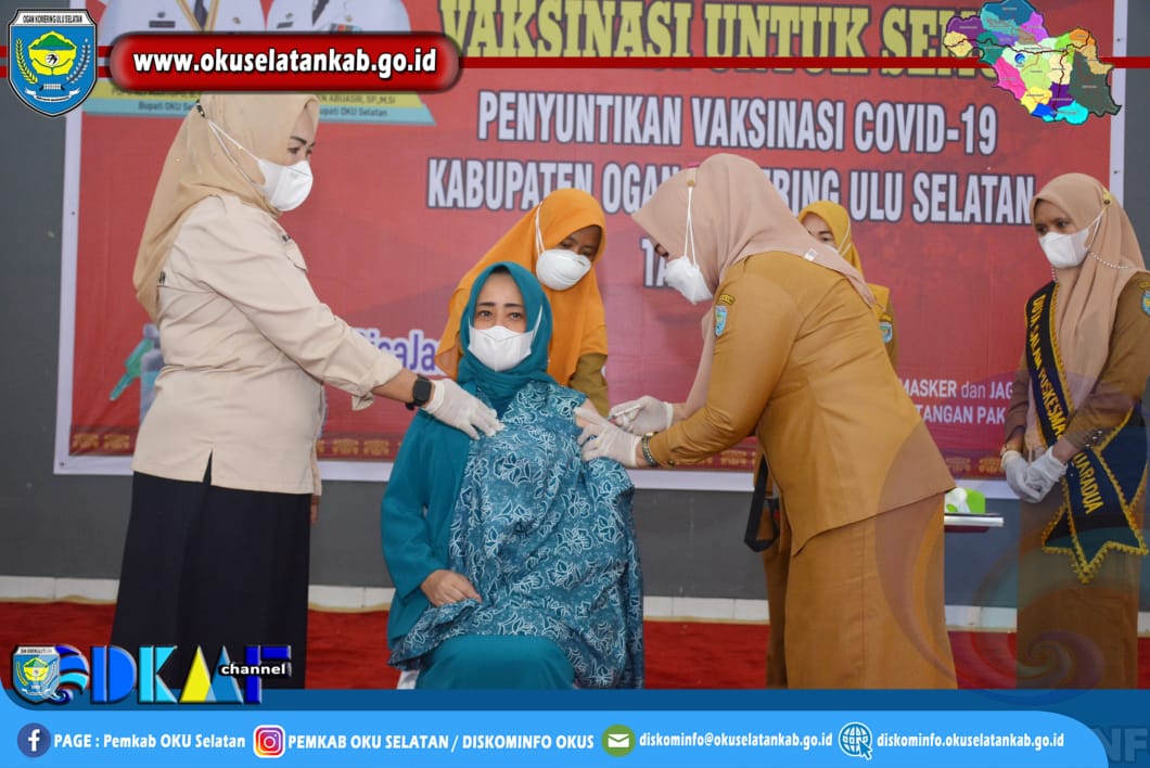 Dalam kesempatan ini, Ketua TP PKK Kabupaten OKU Selatan Isyana Lonitasari Popo menjadi orang pertama yang disuntik vaksin ditahan dua ini, disusul Wakil Ketua TP PKK Kabupaten OKU Selatan Rosita Devi Sholehien dan para peserta lainnya.